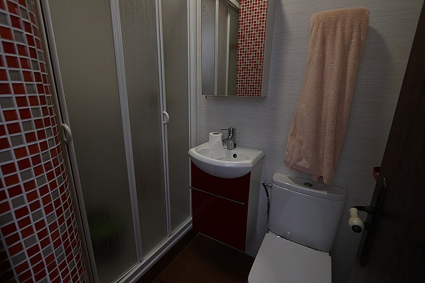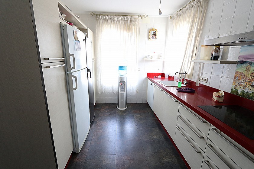 Langs een gang is de volledig ingerichte moderne keuken en aan het einde van de gang aan de achterzijde van de begane grond is een grote slaapkamer met tweepersoonsbed en een badkamer, zodat iedereen die moeite heeft met trappen een suite op de begane grond heeft.
