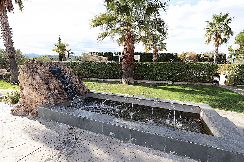 Terwijl je jezelf bij elkaar rapt, kom je erachter dat dit de achterkant van de villa is en de voorkant is nog beter, waar je ook een grote moderne fontein vindt en een prachtig zwembad met poolhouse om de pomp en filter te verbergen.