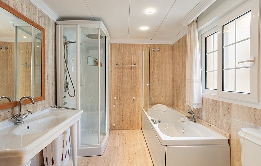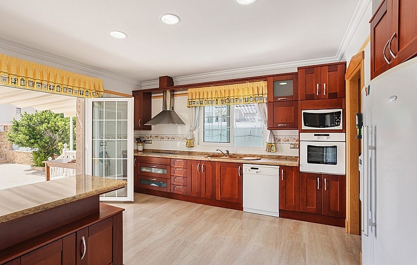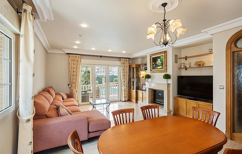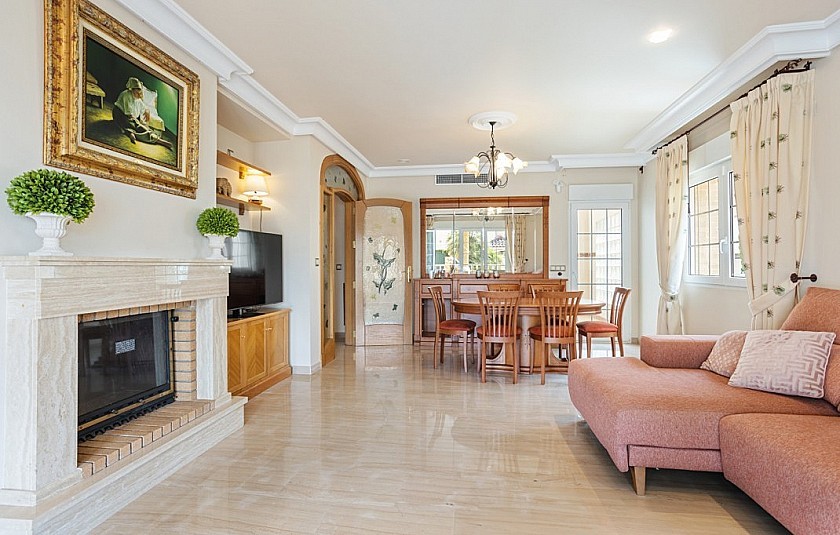 Via de inkomhal, die in open verbinding staat met de 1e verdieping, zijn aan de linkerkant de keuken en bijkeuken, een slaapkamer en een gastenbadkamer bereikbaar. In het midden vindt u een ruime slaapkamer met en-suite badkamer en aan de rechterkant via de dubbele deuren het eetgedeelte en de woonkamer.